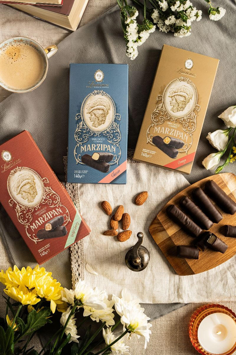 Griechische Zartbitterschokoladen-Bars mit fruchtiger Marzipan-Orangen Füllung. Die edle Schmuckverpackung macht dieses Produkt zu einem tollen Geschenk.