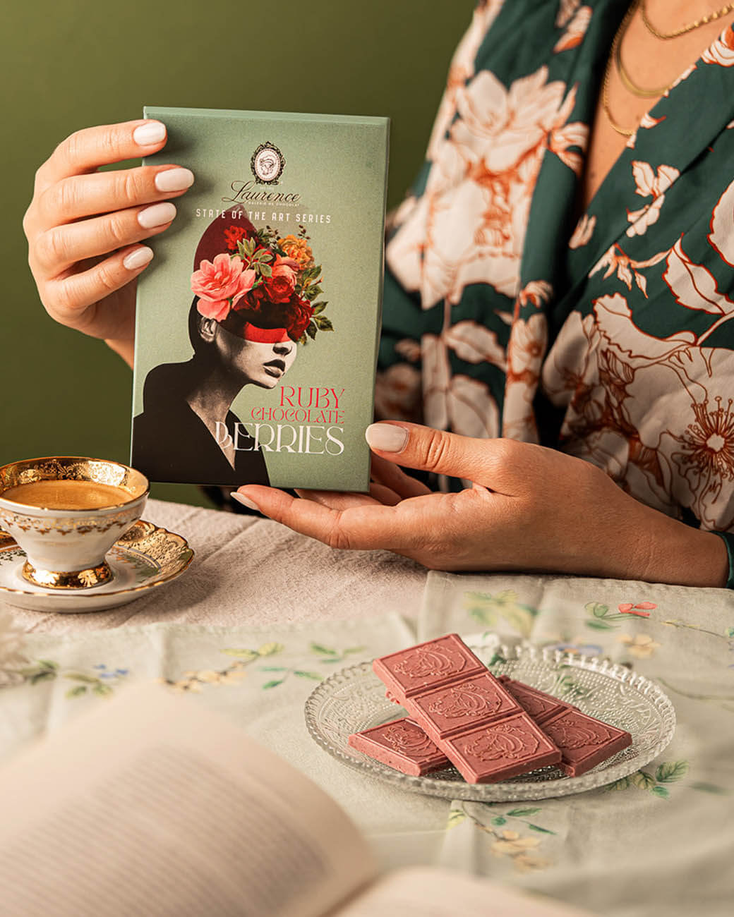 Zartschmelzende feine Ruby-Tafelschokolade (Kakaogehalt 41,8%) von Laurence aus Griechenland mit Erdbeeren und Cranberries. Die State of the Art Linie überzeugt nicht nur mit fantastischem Geschmack, sondern auch durch ihr außergewöhnliches Design. Diese edle Schmuckverpackung eignet sich auch ideal als Geschenk.