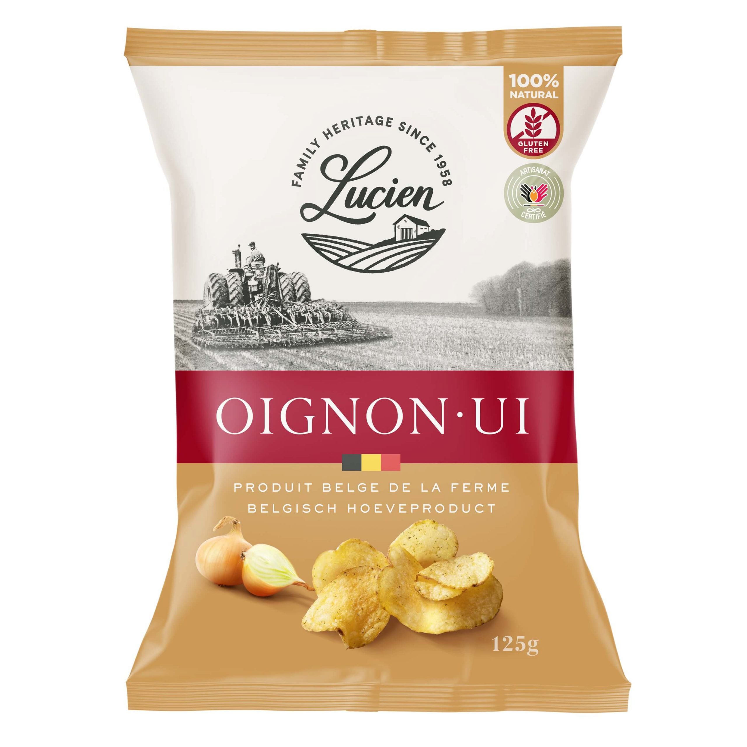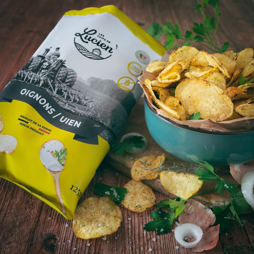 Handwerkliche Chips direkt von einem kleinen belgischen Kartoffelhof, der von drei Cousins bewirtschaftet wird – in der Geschmacksrichtung Zwiebel.