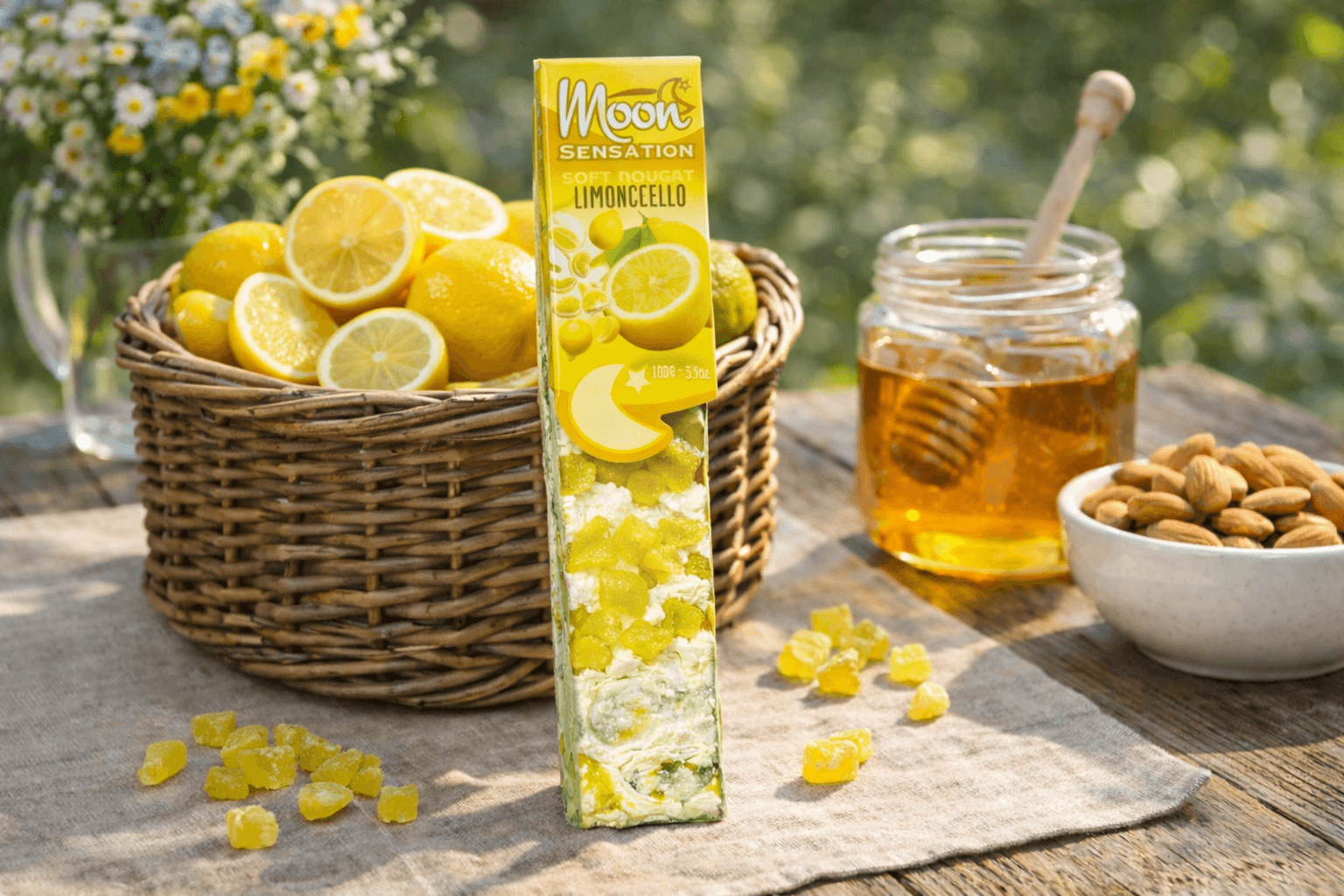 Softnougat ist zart schmelzend, fluffig und voller feiner Aromen. Hergestellt aus feinsten Mandeln, hochwertigem Honig, Zucker und luftig geschlagenem Eiweiß, entsteht eine cremige Textur, die sich hier mit Zitronenstückchen verbindet.