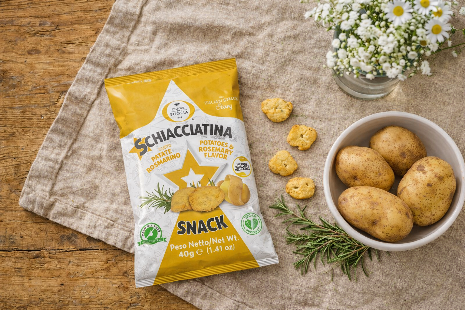 Der kleine Snack für unterwegs – zartes, knackiges Brotteiggebäck, ohne Hefe, mit Weißwein und extra nativem Olivenöl, im Ofen gebacken – mit Kartoffeln und Rosmarin.